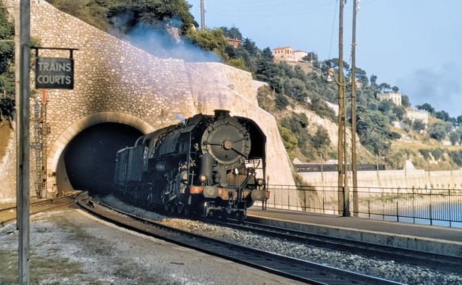 Bild oben: Eine 141.R zieht 1955 einen Schnellzug entlang der Mittelmeerküste durch den Bahnhof Villefranche-sur-Mer. Copyright: Todd Novak / Slg. Eisenbahnstiftung.