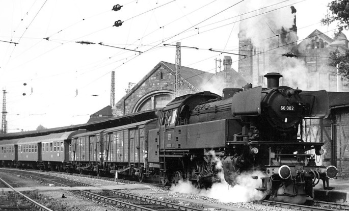 Die 66 002 hat im August 1956 eine typische, wild gemischte Garnitur am Haken. © Kurt Eckert / Slg. Eisenbahnstiftung