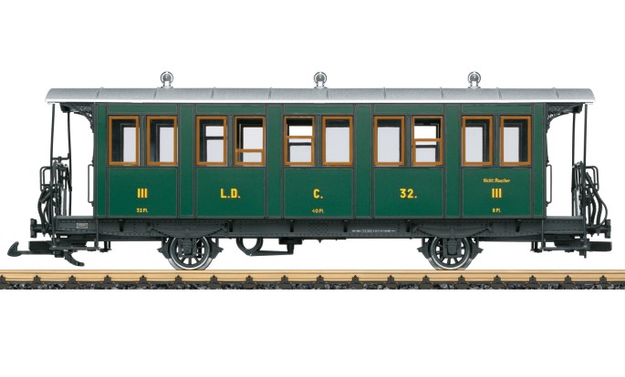 Das LGB Modell bildet einen Personenwagen der 3. Klasse der RhB nach. Ausführung in der grünen Farbgebung der damaligen Landquart-Davos-Bahn, so wie der Wagen heute bei der RhB als Museumswagen im Einsatz ist. Originalgetreue Farbgebung und Beschriftung.