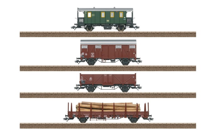 Ein vierteiliger Nebenbahn-Güterzug mit einem Gepäckwagen der ehemaligen Lokalbahnen als Begleitwagen und drei unterschiedlichen Güterwagen mit Beladung.